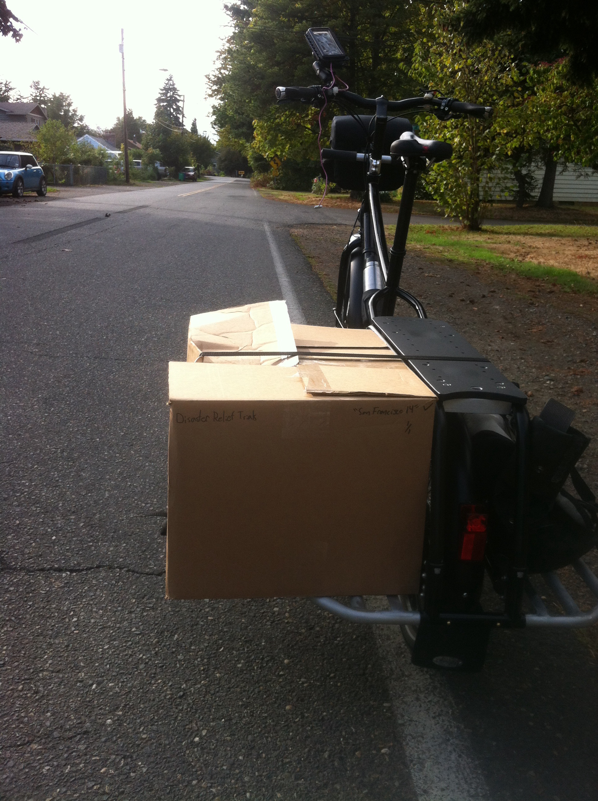 Mark Sullivan reconstitutes his Yuba Mundo after an utterly clean run. No broken eggs, a full five gallons of water, perfect routing. So much style and grace, Mark provided picture perfect advocacy for cargo bikes as disaster response tools.