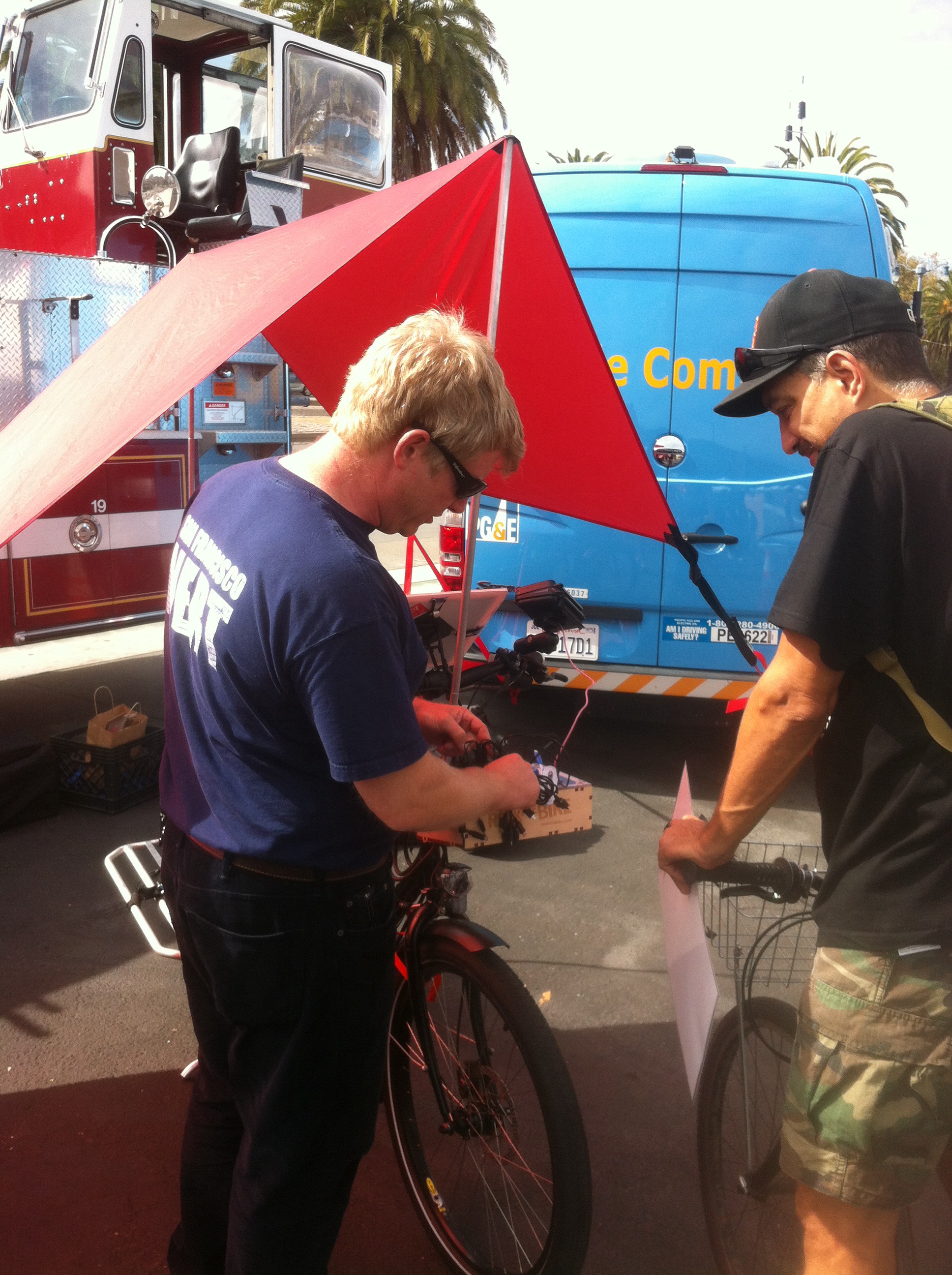 San Francisco’s famous Exploritorium, a hands-on science museum that articulately explains how the world works through interactive exhibits, hosted a 25th anniversary Loma Prieta Earthquake Expo today. Disaster Relief Trials SF was invited, so we happily unveiled the Xtracycle Disaster Response Bike prototype. It carries relief supplies with an industrialized cam buckle-adorned cargo hold and then generates electricity in place, under an integrated silnylon shelter – to charge all those phones, flashlights, and radios, quickly. We made fans and friends.